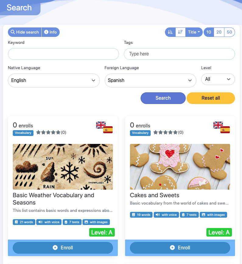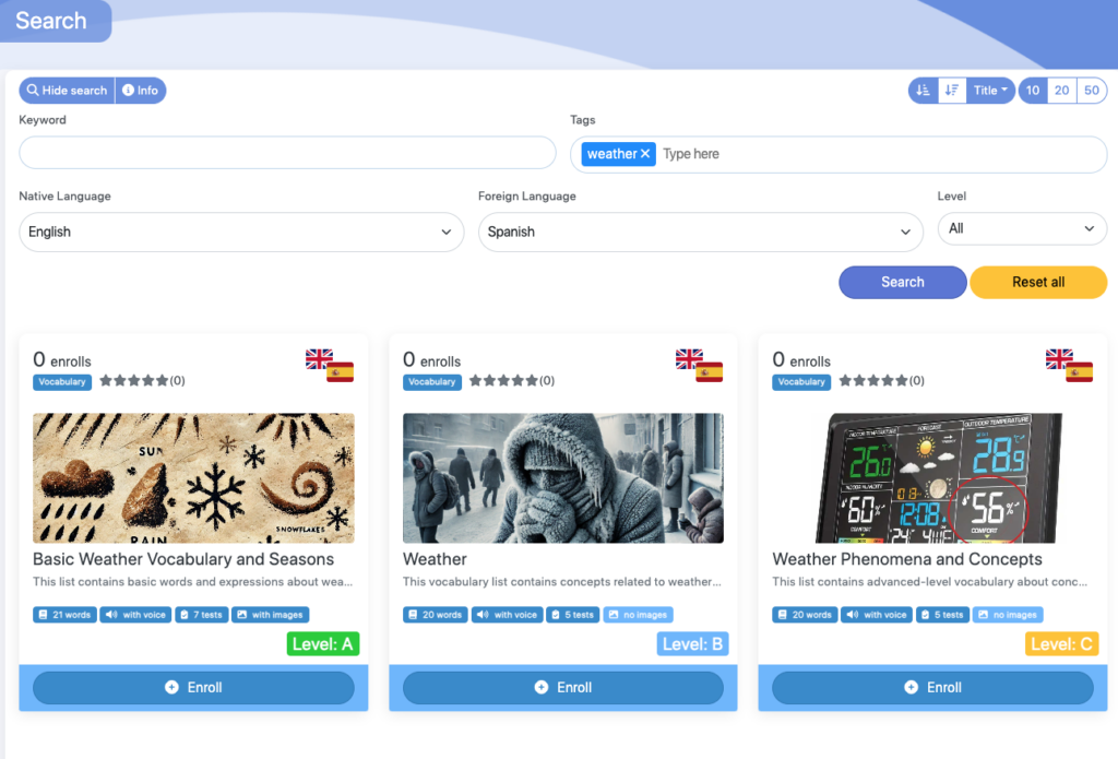 This flexible search system allows students to expand their learning opportunities across multiple languages and find vocabularies tailored to their needs.