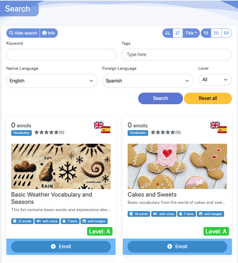 A keresési eredmények között böngészve a diákok kiválaszthatják a nekik tetsző szókincs készleteket. Ezeket felvehetik a saját könyvtárukba, hogy később tanulhassanak belőlük.