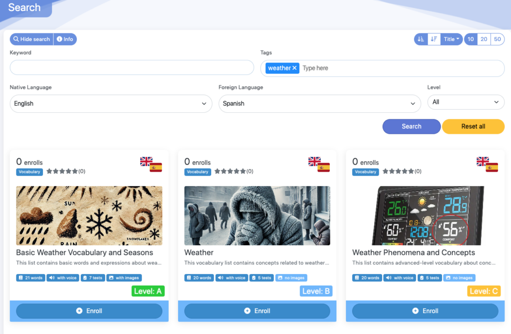 3. Találati lista: Az eredmények igazodnak az általad kiválasztott szinthez, és olyan szókincs készleteket mutatnak, amelyek megfelelnek a tanulási szintednek és vizsgára való felkészülésednek.
